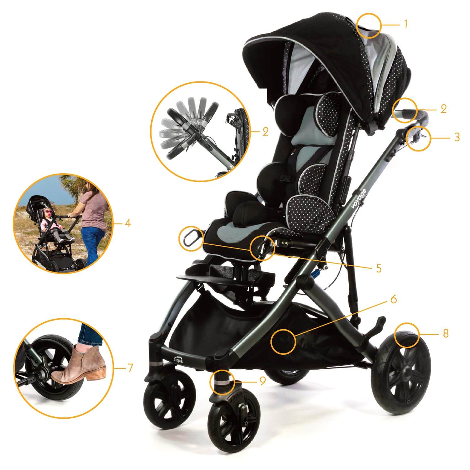 Discover freedom and comfort with the Zippie Voyage, a lightweight, foldable early-intervention stroller that grows with your child. With adjustable tilt, recline, and customizable head and body supports, it’s designed for comfort and adaptability. Featuring flat-free wheels, easy folding, and transit approval, the Voyage is perfect for active families.
